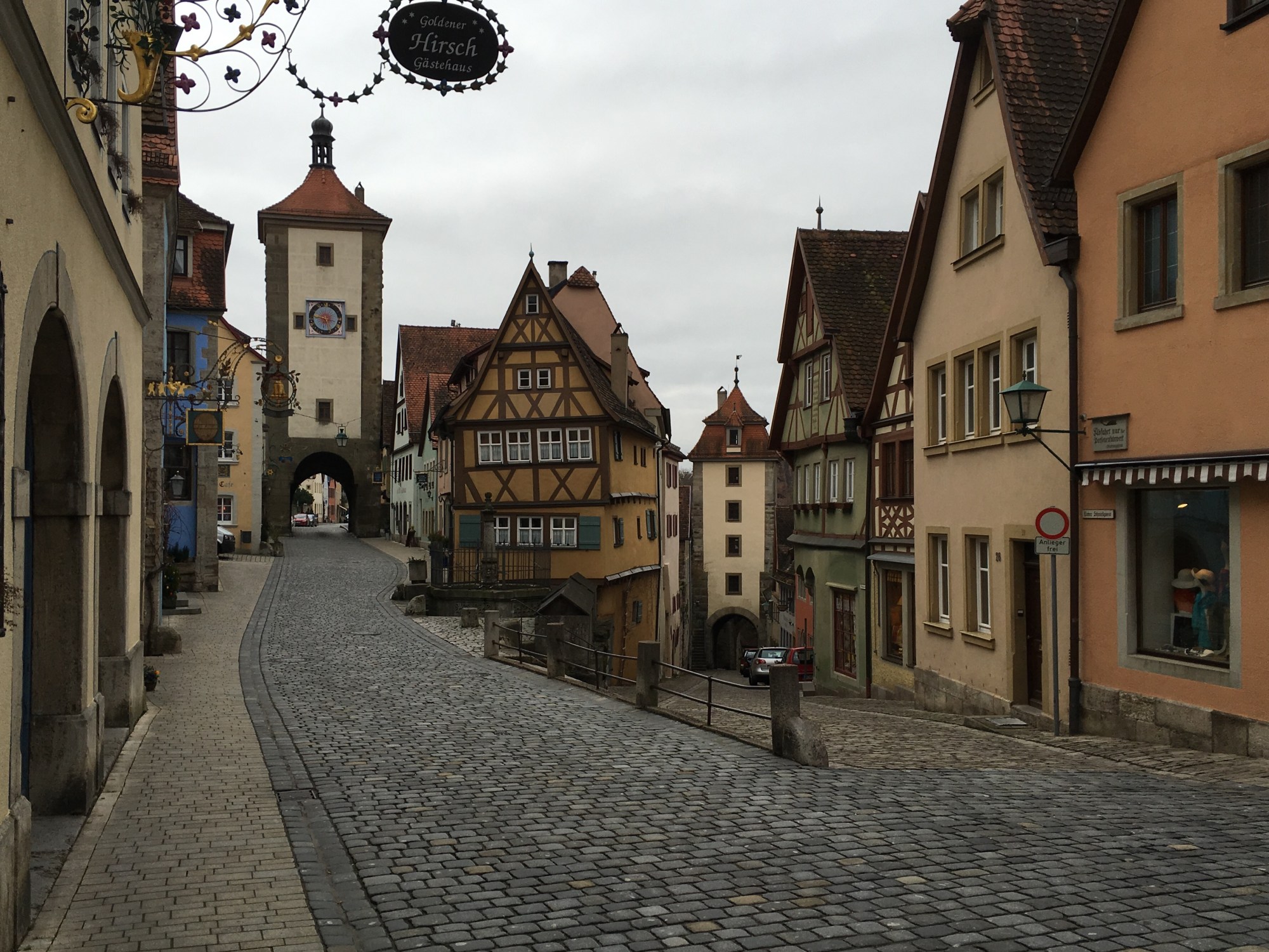 The restaurant “Zur Höll” (meaning literally to hell – yikes!) is the oldest building in Rothenburg. I sampled the local wine and ordered the sausage platter for dinner while Alex tried the daily special, duck. It turned out to be a pretty cool restaurant and the food was delicious! After sampling the wine I had to use the bathroom. If you’ve ever traveled with me, you would know how terrible I am at figuring out European bathrooms and today was no exception. In my defense, this bathroom was…interesting. It started out fine, the first door was clearly labeled with “toiletten” so I walked through it and came upon another option. To the left was the kitchen, to the right was a staircase and straight ahead was a door with a swan on it. I choose the swan. That door brought me outside into the rain! But it turned out to be the correct choice and the bathroom was actually another 20 steps further outside, in this creepy alley, in two separate men/women buildings. It was the weirdest thing, I don’t think I’ll ever understand European bathrooms – at least I didn’t have to pay at this one!